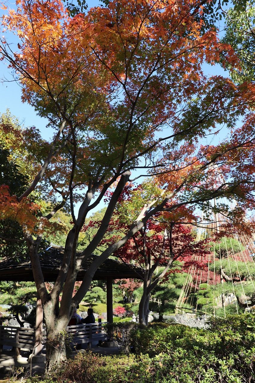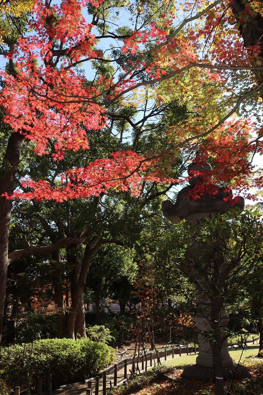 花畑記念庭園のモミジの紅葉は7分でグラデーションが楽しめます。 秋のライトアップ開催中です。 来週土日は混み合うことが予想されますので、今日は曇りですが風がないのでおすすめです!